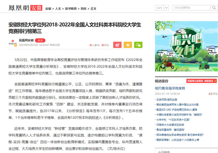 近日,凤凰网以《安徽财经大学位列2018-2022年全国人文社科类本科院校大学生竞赛排行榜第三》为题,报道我校在2018-2022年全国人文社科类本科院校大学生竞赛榜单中位列第三,这也是我校连续第三年位列此榜单第三。