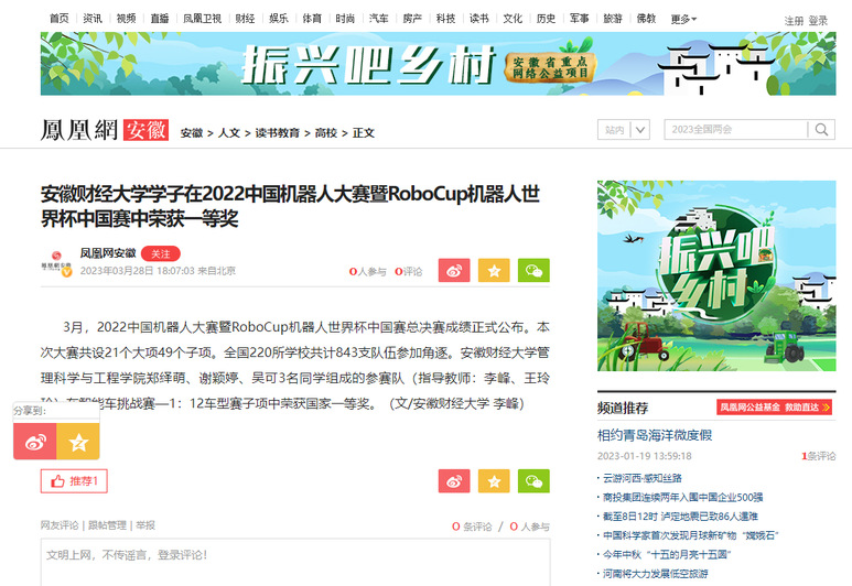 3月28日,凤凰网以《安徽财经大学学子在2022中国机器人大赛暨RoboCup机器人世界杯中国赛中荣获一等奖》为题,报道我校管理科学与工程学院郑绎萌、谢颖婷、吴可3名同学组成的参赛队(指导教师:李峰、王玲玲)在智能车挑战赛—1:12车型赛子项中荣获国家一等奖。