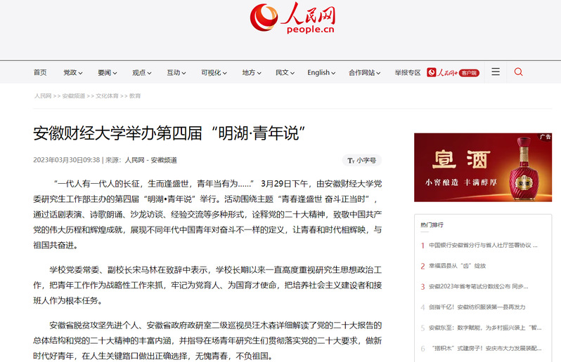 人民网、凤凰网分别以《安徽财经大学举办第四届“明湖·青年说”》《青春逢盛世 奋斗正当时——安徽财经大学举办第四届“明湖·青年说”》等为题报道我校举办第四届“明湖·青年说”。