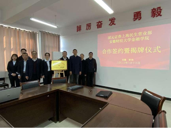 2023年3月13日上午,我院与国元证券上海民生路证券营业部举行合作签约暨揭牌仪式。院党委书记蒋晓华,国元证券上海民生路证券营业部总经理臧东东,院长万光彩,副院长郑军、舒家先,教师高志及国元证券上海民生路证券营业部投教负责人李武青,金牌顾问周绪田,客户经理任筱翮参加了签约揭牌仪式,会议由万光彩主持。