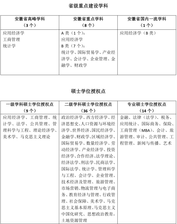 学校坚持育人为本。建校以来,累计为国家和社会培养各类人才18万余人。学校目前在全国31个省(市、自治区)一本批次招生,现有全日制本科生、研究生20317人,继续教育学生1万余人。现有50个在招本科专业,其中国家级一流本科专业建设点24个、省级一流本科专业建设点18个,一流专业占比位居安徽省高校第2。现有5门课程入选首批国家一流课程、1门课程入选首批国家级课程思政示范课程。学校学生在学科竞赛中的成绩,位列2017至2021年全国普通高校大学生竞赛榜单人文社科类高校第3。学校不断推进知识探究、能力提升、素质培养、人格养成“四位一体”人才培养体系建设,不断深化“新文科”“新工科”人才培养改革,探索实践“新经管”人才培养模式,致力于培养具有社会责任感、人文情怀、科学精神和国际视野的高素质创新型人才,毕业生受到社会广泛认可。