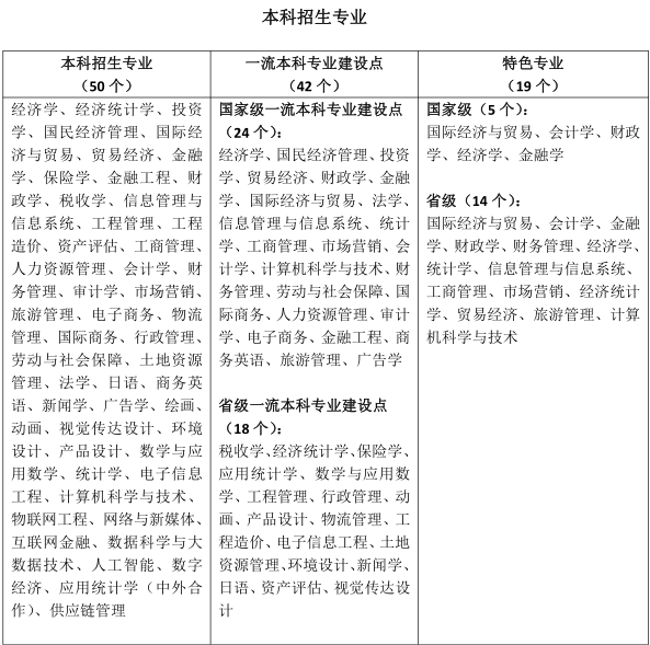 学校坚持学科引领。学科覆盖经济学、管理学、法学、文学、理学、工学、艺术学等七大门类,是一所多科性财经大学,是我国首批具有学士学位授予权、第三批具有硕士学位授予权的高校。现有经济学院、金融学院、国际经济贸易学院、工商管理学院、管理科学与工程学院、会计学院、财政与公共管理学院、法学院、统计与应用数学学院、艺术学院、文学院、马克思主义学院、体育教学部等13个学院(部)。拥有3个省级高峰学科、8个省级重点学科。在2021年软科发布的“中国最好学科排名”榜单中,学校应用经济学、工商管理、统计学等三个学科进入前20%。根据科睿唯安(Clarivate Analytics)2022年5月ESI(基本科学指标数据库)数据显示,学校工程学(Engineering)、社会科学(Social Sciences,General)学科进入全球ESI排名前1%。学校拥有9个一级学科硕士学位授权点、36个二级学科硕士学位授权点、14个专业硕士学位授权点。