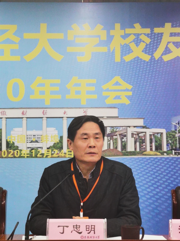 会上,丁忠明首先代表学校和总会向各地校友会和校友的辛勤工作和无私奉献表示感谢,对2020年校友总会及各地校友会工作的开展表示肯定。随后,他从安财新经管战略持续推进、人才培养成效显现、师资队伍建设增强、科研服务能力提升、党建工作持续深化、扶贫攻坚开花结果等六个方面向大家详细介绍学校2020年在疫情背景下所取得的不易成绩。最后他对校友会下一步工作提出三点期望和建议,第一,要明确校友会组织的性质和意义。要将校友会组织打造成为广大校友提供沟通和交流的平台。第二、要规范化运作。要加强学习提高政治站位,遵纪守法,加强自身建设,不断规范管理,提升服务各地校友的能力和水平。无论在何时何地举办各类校友活动都要以新时代习近平重要思想为指导,始终把握政治方向。第三,要制定出台专门的地方校友会校友工作指导意见。各地校友会要明确自身组织定位,校友总会帮助、指导各地校友会规范化运作,尽可能为安财校友后续成长提供力所能及的帮助。